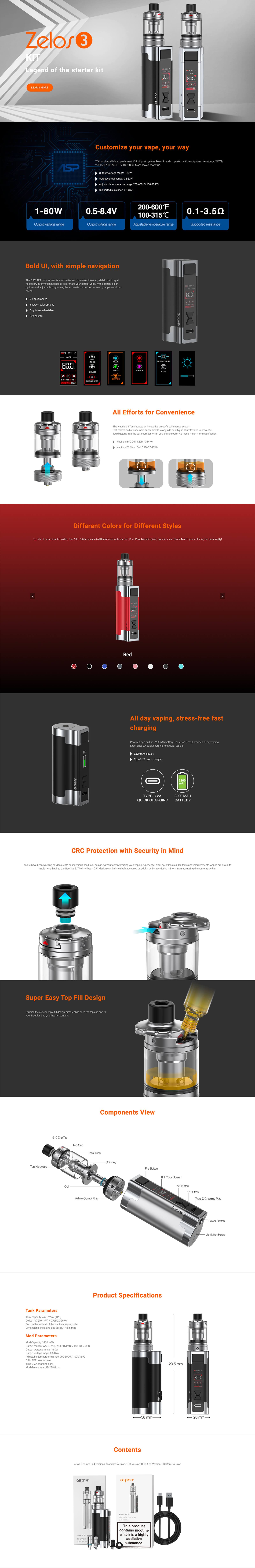 Aspire Zelos 3 80W Mod Kit3200mAh dahili bataryası ve tamamen yeni Aspire Nautilus 3 Tankı ile birleşen güçlü bir cihazdır.