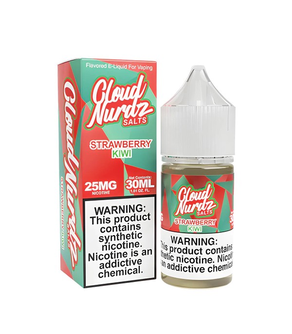 Cloud Nurdz Strawberry Kiwi Iced Salt Likit, tatlı çilek ve ekşi kivi aromalarını buz ferahlığıyla buluşturur. 30 mL, 25 mg / 50 mg nikotin seçenekleri, 60VG/40PG oranı.