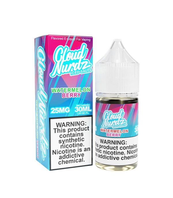 Cloud Nurdz Watermelon Berry Iced Salt Likit, sulu karpuz ve tatlı orman meyvesi aromalarını buz ferahlığıyla birleştirir. 30 mL, 25 mg / 50 mg nikotin seçenekleri, 60VG/40PG oranı.