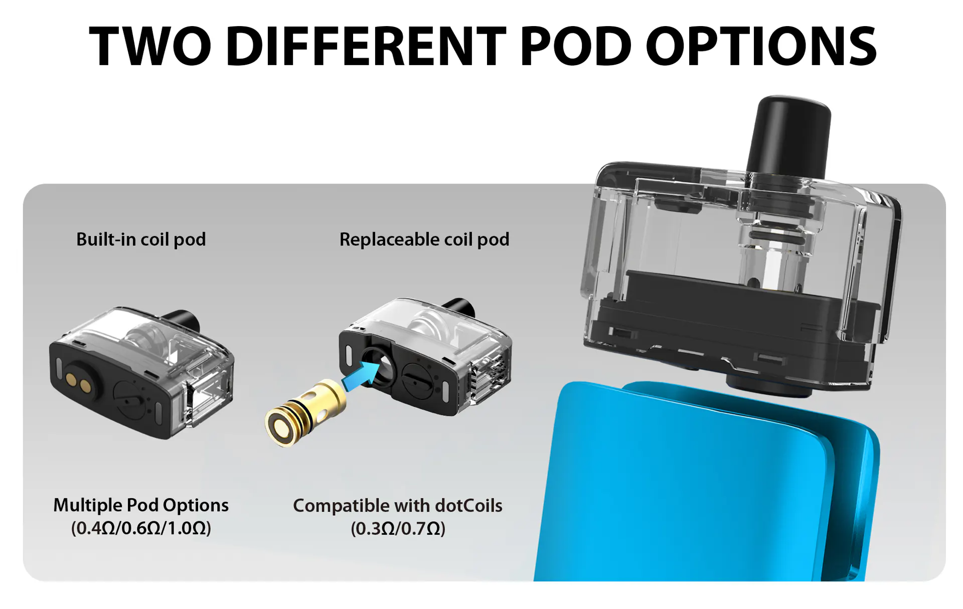 • Uyumlu coil seçenekleri: 0.3 Ohm / 0.7 Ohm / 0.9 Ohm DotCoil pod’lar