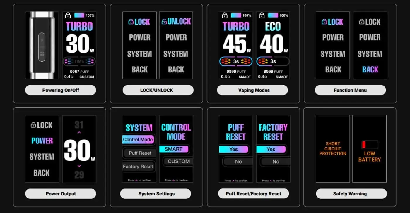 • 45W Boost Mode (0.4 Ohm pod ile) — daha güçlü buhar performansı isteyenler için