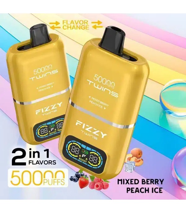 Fizzy Twins Mixed Berry & Peach Ice 50.000 Puffs, çift aromayı tek cihazda sunan ve uzun ömürlü bir vaping deneyimi isteyen kullanıcılar için tasarlanmış bir tek kullanımlık pod cihazıdır. 50.000 çekim kapasitesi, şarj edilebilir bataryası ve metal gövdesiyle hem dayanıklı hem de pratik bir kullanım sunar.