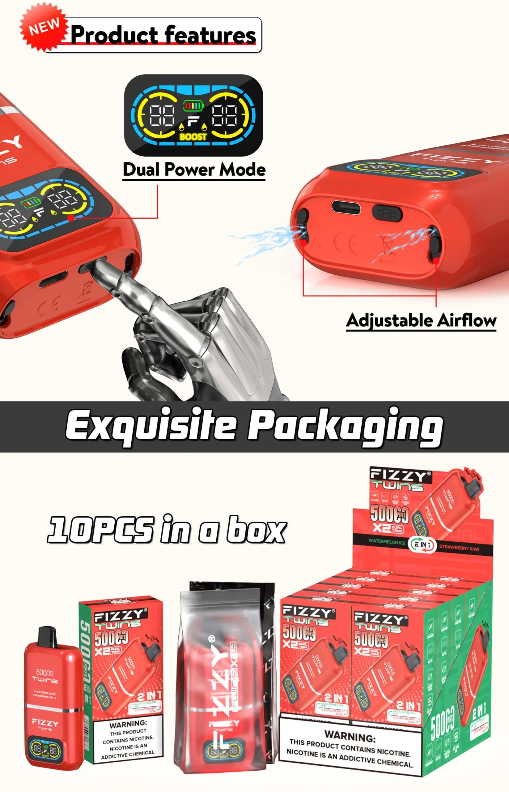 Fizzy Twins Mixed Berry & Peach Ice 50.000 Puffs, 50.000 puff kapasitesi, çift aroması ve şarj edilebilir yapısı ile tek kullanımlık vape kategorisinde öne çıkmaktadır. Aroma ve buhar performansını dengeli bir şekilde sunar; lezzetten ödün vermek istemeyenler ve pratik kullanım arayanlar için güçlü bir seçimdir.