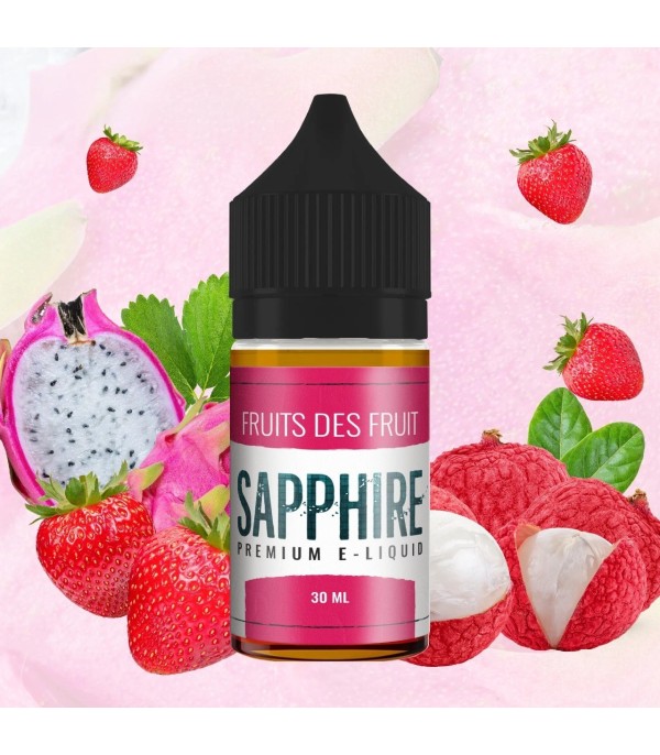Sapphire Fruits Des Fruit E-Likit, Sapphire I Love likit serisinin bir parçası olup, tatlı çilek, dragon meyvesi ve lychee (ejder meyvesi) aromalarının mükemmel birleşimiyle tropikal bir lezzet deneyimi sunar. Nikotin tuzu teknolojisi sayesinde pürüzsüz bir içim deneyimi ve tatmin edici nikotin hissi sağlar.