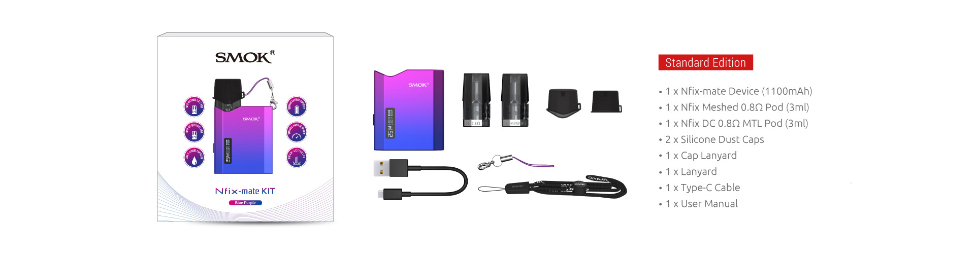 SMOK Nfix-mate Pod Mod Kit, kompakt ve taşınabilir yapısıyla birlikte güçlü performans sunan bir pod mod cihazdır. Dahili 1000 mAh bataryası sayesinde 1-25 watt arasında ayarlanabilir çıkış gücüne sahiptir. Cihaz, kullanıcılara uzun süreli kullanım imkanı sağlarken, USB Type-C şarj portu ile hızlı ve güvenli bir şekilde şarj edilebilir. SMOK Nfix-mate’in 3 ml kapasiteli kartuşu, likit seviyesini rahatça görebileceğiniz şeffaf bir tasarıma sahiptir, bu da kullanım kolaylığı sunar.