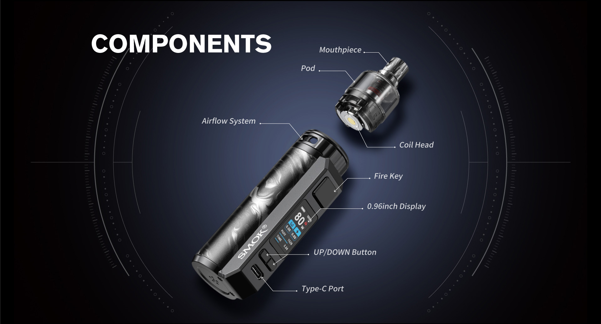 Smok RPM 5 Pod Mod: 2000mAh batarya, 80W güç, 5.5ml likit kapasitesi. Yenilikçi tasarım ve üstün performansla mükemmel elektronik sigara deneyimi!