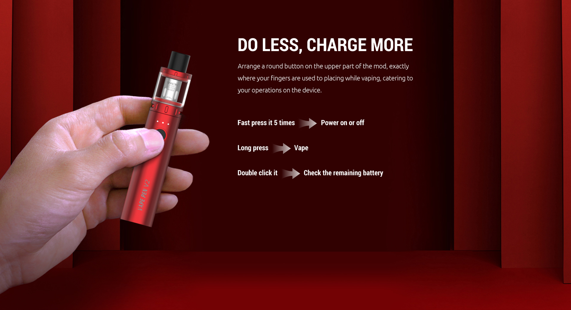 Smok G-PRIV PRO Pod Mod, harici bir 18650 pil ile çalışan bir cihazdır, 5.5 mL'lik geniş likit depolama kapasitesine, 5Watt ila 80Watt arasında ayarlanabilir akım çıkış gücüne sahiptir.