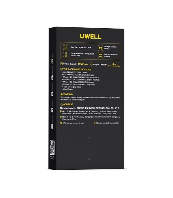 Coil: Uwell Caliburn Explorer Pod Mod, 0.8 Ohm, 1.0 Ohm ve 1.2 Ohm coil direncinde mevcut olan Uwell Caliburn G Coil ve Uwell Caliburn G2 Coil serisiyle uyumludur. Kısıtlı Doğrudan Akciğere (RDTL) kullanımı tercih ediyorsanız, 0.8 Ohm mükemmel bir seçim olacaktır, 1.0 Ohm ve 1.2 Ohm Ağızdan Akciğere (MTL) kullanımı için benzersizdir.