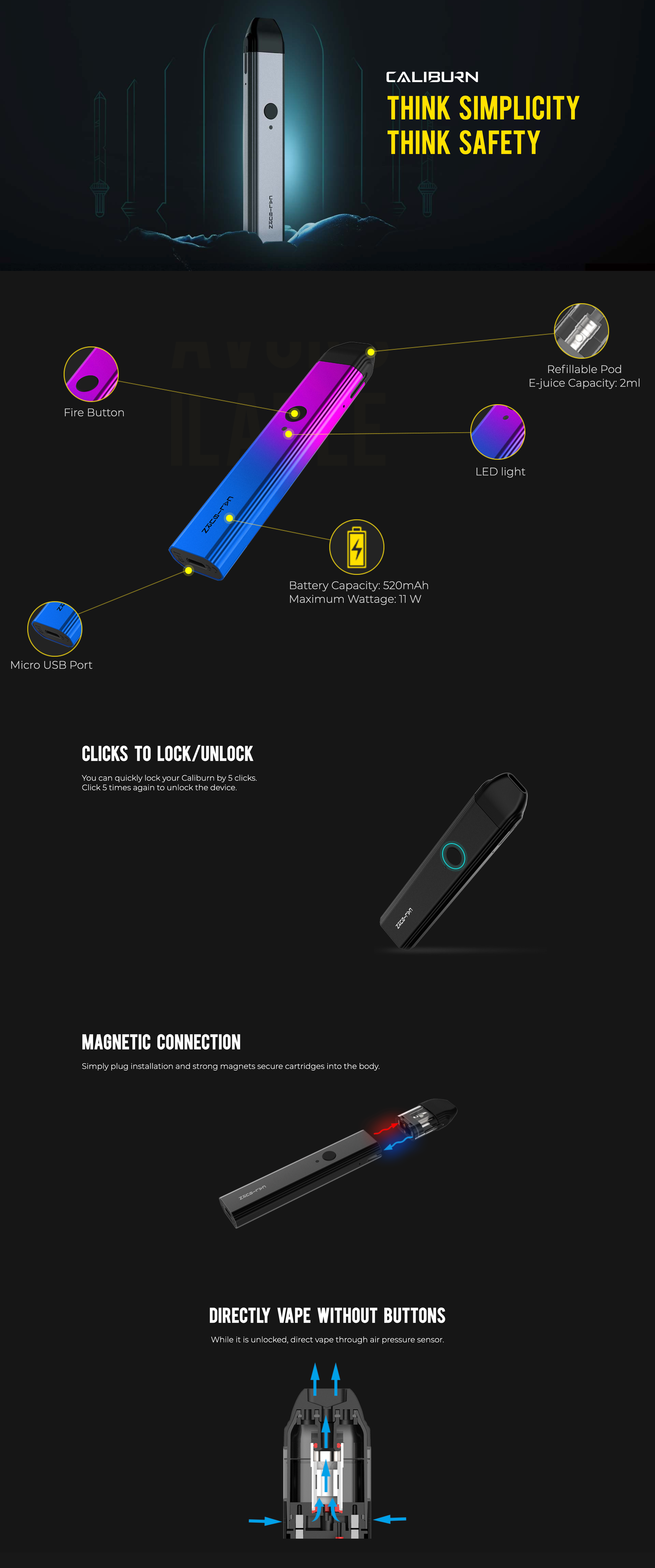 Caliburn, yüksek buhar kalitesi ve kolay kullanımı ile öne çıkar. Kartuşların takılması ve çıkarılması kolaydır, ayrıca oldukça uzun ömürlüdür. Coiller değiştirilemez olsa da, kartuşun tamamen değiştirilmesi gerekir, bu da cihazın bakımını oldukça basit hale getirir. USB hızlı şarj desteği ile pilin kısa sürede tamamen şarj olması, cihazın gün boyunca sürekli kullanılmasına imkan tanır.
