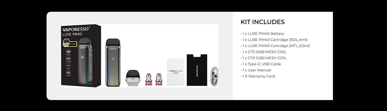 Luxe PM40, hem GTX 0.6 Ohm mesh coil hem de GTX 0.8 Ohm mesh coil seçenekleriyle gelerek farklı buhar ve lezzet deneyimlerine olanak tanır. Cihazın her iki yanında IML paneller bulunur, bu da ona modern ve zarif bir görünüm kazandırır. 2A hızlı şarj desteğiyle, cihazı tam dolu bir batarya ile bir gün boyunca rahatlıkla kullanabilirsiniz. Ayrıca, şeffaf kartuş tasarımı, likit seviyesini kolayca görüp takip etmenizi sağlar. Vaporesso Luxe PM40, hem performans hem de estetik açıdan kullanıcı dostu bir pod mod cihazdır.