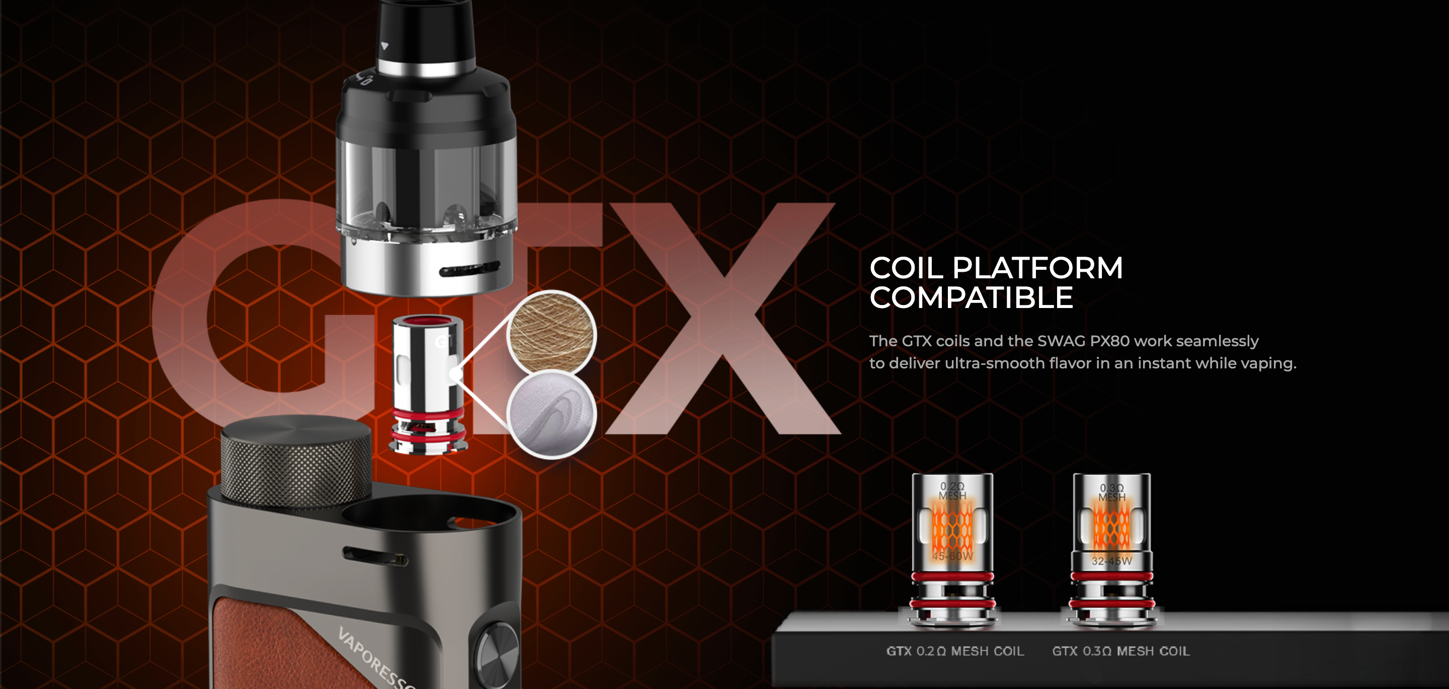Vaporesso Swag PX80 Pod Seti kompakt gövdesiyle en 80W pod kiti. Vaporesso Swag PX80 Kit, IML ekranını dokulu kapağın altında mükemmel bir şekilde gizleyerek gömülü IML ekranı benimser. Tek bir 18650 pil ile Vaporesso Swag PX80 Pod Sistemi, 5-80W ayarlanabilir watt sağlayabilir. AXON CHIP özelliğine sahip olan Vaporesso Swag PX80 cihazı 0.001 saniye anlık ateşleme performansı sunar. Çeşitli koruma fonksiyonları ile Vaporesso Swag PX80 cihazını endişelenmeden kullanabilirsiniz. Ek olarak,  Vaporesso Swag PX80 Pod , 4ml likit kapasitesi ve GTX 0.2 Ohm Mesh Coil / GTX 0.3 Ohm Mesh Coil ile birlikte gelir. Antibakteriyel keten pamuğu ve dokumasız kumaşı entegre eden GTX coilleri, herhangi bir sapma olmaksızın saf tadı pürüzsüzce sunar. GTX coilleri ve SWAG PX80, çekim sırasında anında ultra pürüzsüz lezzet sunmak için sorunsuz bir şekilde çalışır.