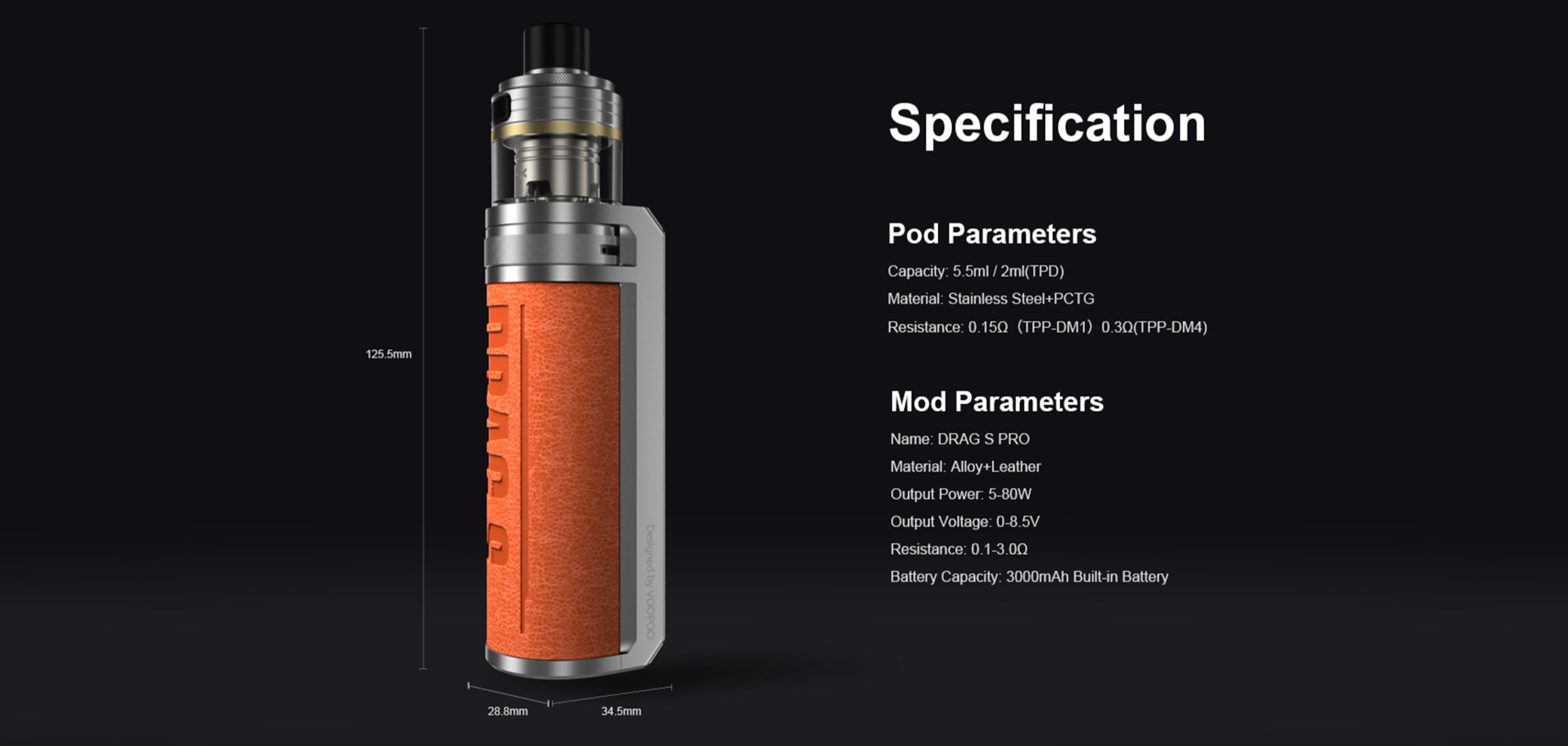 Voopoo Drag S Pro Pod, 3000mAh dahili pil kapasitesine sahip, maksimum 80W çıkış gücü sunan güçlü bir pod mod cihazıdır.